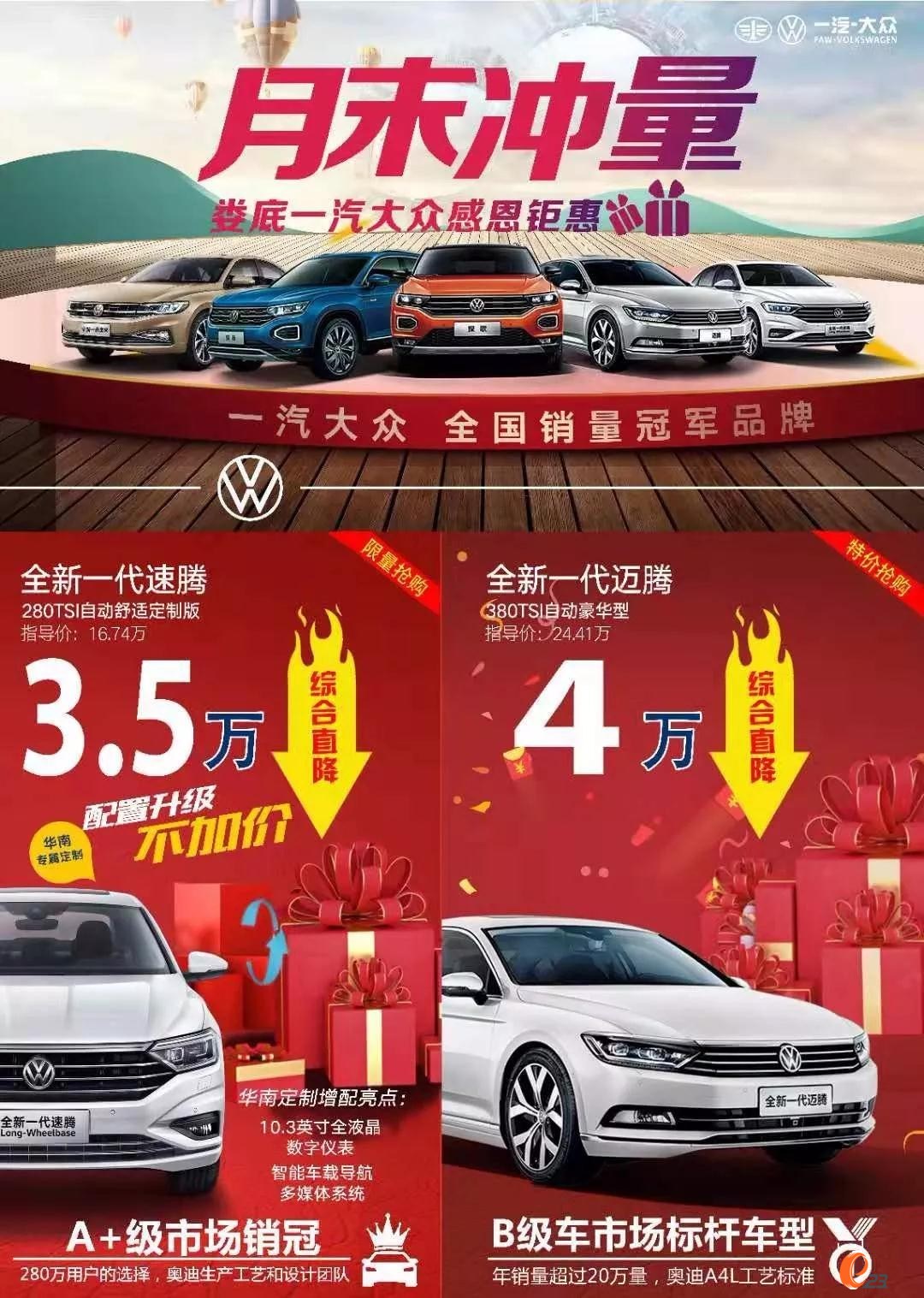 【月末冲量】新速腾定制版加配不加价 综合直降3.5万 迈腾最高综合直降4.6万