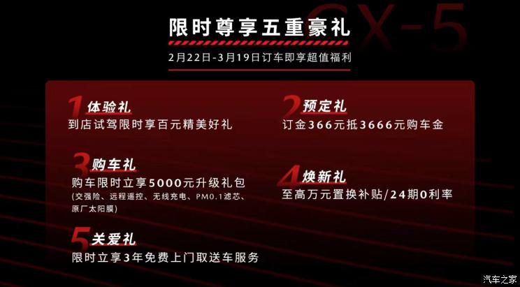 [ 资讯] 2月22日,新款马自达CX-5正式开启预售,新车预售价17.98万起。为此,马自达推出“预售期尊享 万元补贴限时礼遇”五重豪礼,不仅有366元抵3666元购车金,更有至高万元的置换补贴。与此同时,我们获取到了新款马自达CX-5(参数|询价)车型的配置信息,新车将推出6款配置车型,动力上则搭载2.0升与2.5升自然吸气四缸发动机,按照规划新车有望于2022年第一季度正式上市。