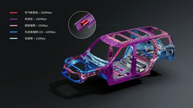 战甲车身采用超高强度笼式安全结构,上车体20个关键环状结构搭配下车体四纵十横非承载式设计,构建起坚不可摧的车身框架;全车高强度钢占比超83.2%,2000MPa热成型材料使用长度达12.48m,均为行业顶级水平。其中,1500MPa一体式热成型门环、1500MPa A柱内板、2000MPa A柱内嵌热气胀管梁,不仅将A柱障碍角缩减至4.15°,提升驾驶视野,更能在正面、侧面碰撞或顶压时有效防止座舱形变;2000MPa双车门防撞板、9孔加强门槛梁,进一步强化侧撞和翻滚防护,给车内人满满的安全感。
